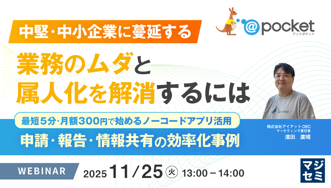 本セミナーでは、 プログラミング不要で 最短5分・1人300円から始められるノーコードアプリ「@pocket」 を活用し、中堅・中小企業が抱える業務の非効率をどのように解消できるかを、調査レポートのデータと実際の導入事例を交えて解説します。